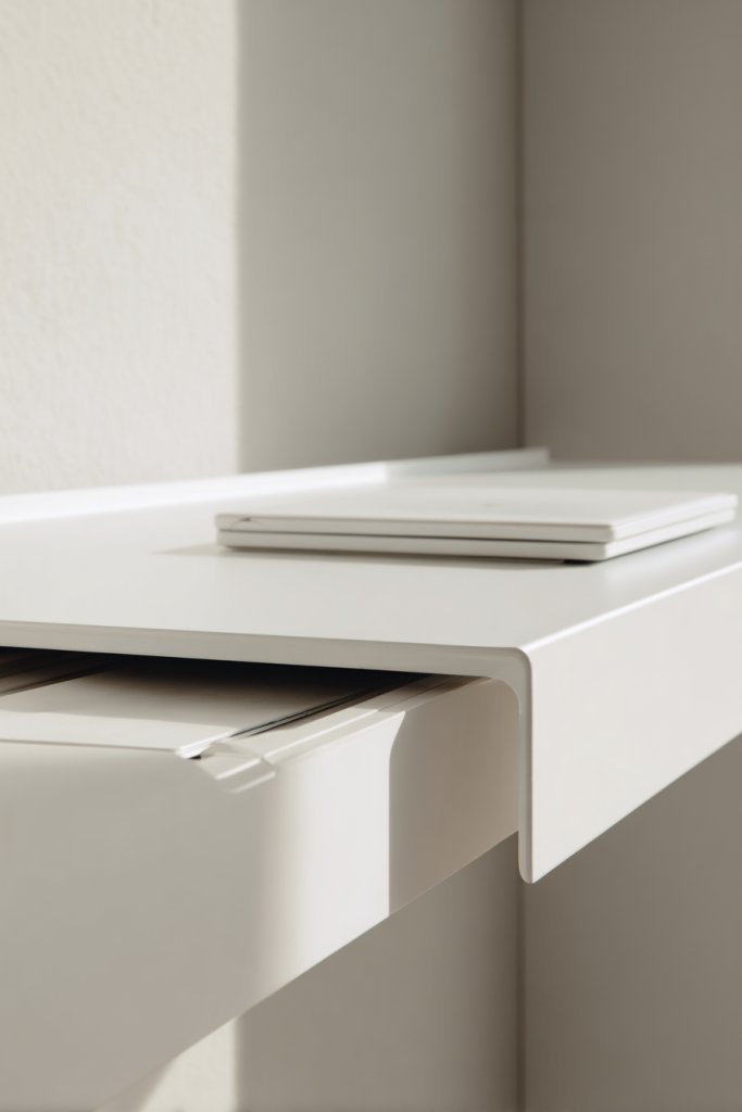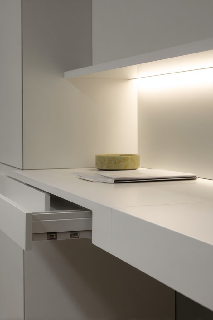 Visualize a sleek desk with built-in drawers and hidden compartments, seamlessly integrated into the surface. A flip-up panel reveals a storage space for cables, notebooks, or stationery, keeping everything out of sight. The surface remains clean and smooth, with just a few carefully chosen accessories. The design emphasizes minimalism, with clean lines and subtle hardware. It’s a workspace that looks neat but is full of clever storage tricks.