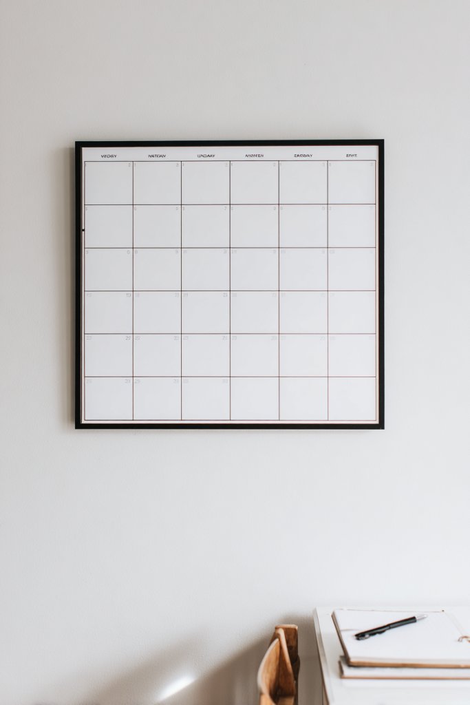 Picture a slim, matte black or white frame surrounding a clean, minimalist calendar. The calendar is filled with handwritten notes, color-coded tasks, and motivational stickers—all organized neatly. It hangs at eye level, immediately drawing your attention when you enter the room. The plain background and simple layout make planning less overwhelming and more inviting. It’s a functional art piece that keeps your priorities visible.