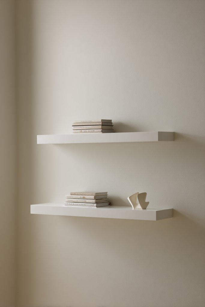 Picture slim, matte-finished shelves floating seamlessly against a neutral-toned wall, holding neatly stacked books, notebooks, and decorative bins. The shelves’ minimalist design complements modern decor, while their hidden brackets create a clean, uncluttered look. Small vials or sculptural objects sit beside your study materials, adding personality. The wall feels open and airy, making the room appear larger and more inviting—a perfect backdrop for your studying zone.