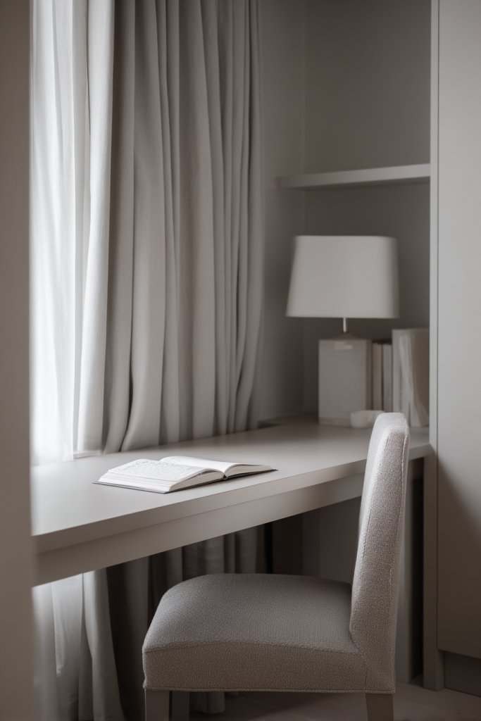 Visualize soft beige walls paired with light gray accents and creamy textiles. The room feels airy and uncluttered, with subtle textures like linen or cotton adding depth without visual noise. Natural light bounces gently off the walls, enhancing the serene atmosphere. Minimalist furniture with clean lines in muted shades complements the overall calmness. The space feels welcoming and distraction-free, perfect for deep focus or creative thinking.