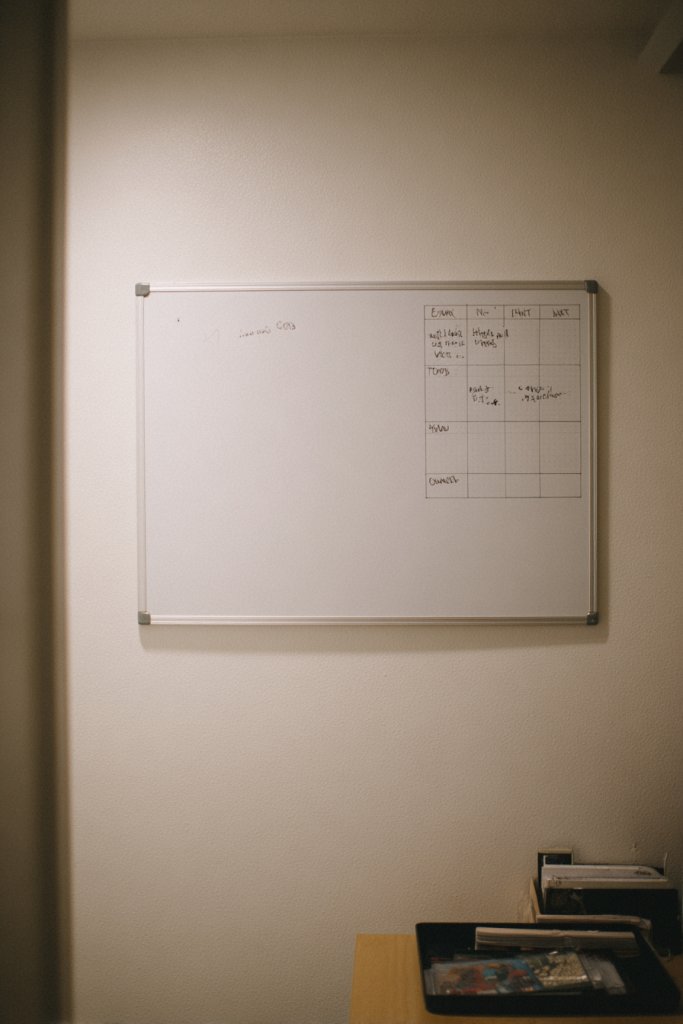 Imagine a sleek, framed whiteboard mounted neatly above your desk, filled with colorful marker notes and checklists. Or picture a corkboard dotted with pinned notes, flashcards, and motivational quotes—organized yet lively. The surface contrasts softly with a neutral wall, creating a focal point that invites interaction. Bright sticky notes and printed schedules add pops of color, making planning feel less like a chore and more like a creative process. It’s your personal command center.