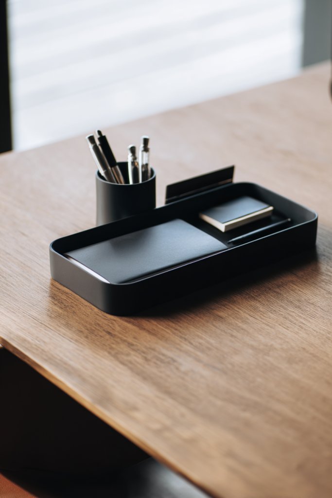 Visualize a sleek, metallic tray with compartments holding pens, highlighters, and sticky notes—all within easy reach. Adjacent, a minimalist acrylic holder keeps your most-used notebooks stacked neatly. The organizer’s modern design with clean lines complements a variety of decor styles, from industrial to Scandinavian. Soft-colored accents, like pastel or neutral tones, soften the overall look. Your desk transforms into a well-curated workspace that screams efficiency.