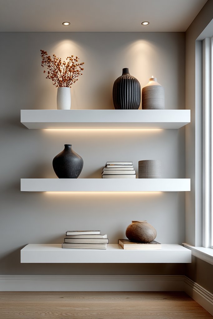 Switch up the decor based on your style—go for bold hues for a lively look or neutral tones for a more serene vibe. Smaller shelves work well in compact spaces, while larger ones can hold more decorative items or even small sculptures. Seasonal accents, like faux snowflakes or cozy textures, can refresh the look without much effort. You can also vary shelf placement for asymmetrical charm.