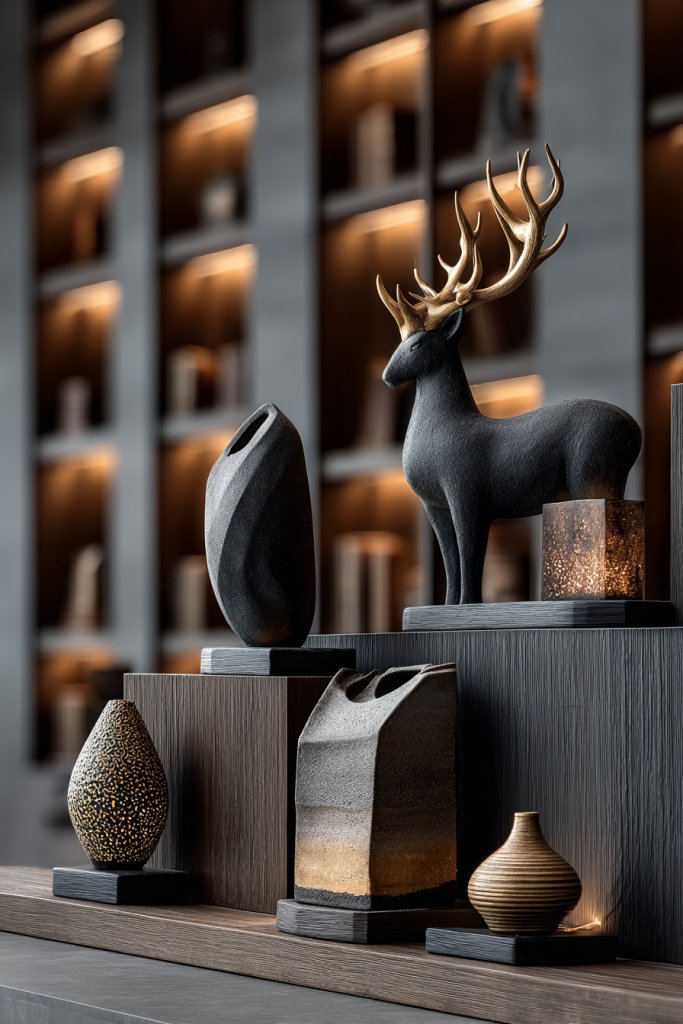 Visualize small, abstract sculptures or modern art objects arranged thoughtfully on open shelves or side tables. Play with different heights, textures, and materials—metal, ceramic, or wood—to create a layered, dynamic display. The sculptures serve as focal points, drawing the eye and adding depth. Soft lighting enhances their shapes and textures, making the entire vignette pop.