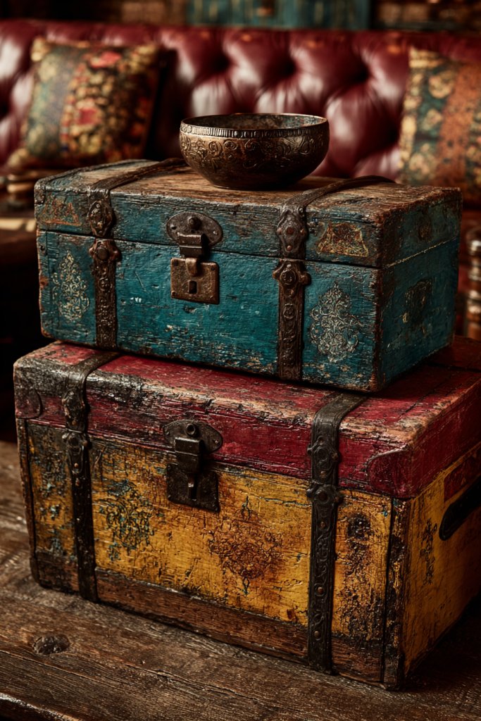 Select trunks and cabinets in various sizes and finishes—weathered wood, distressed paint, or polished veneers—to match your decor theme. Pair with textured textiles or cozy throws to soften the look. For a modern twist, incorporate sleek, minimalist vintage pieces. Use them as a base for decorative objects or as hidden storage for clutter. Rotate or reposition periodically to keep the visual interest alive.