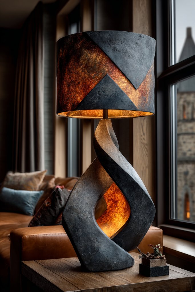 Imagine a bold, sculptural lamp with a unique shape—think twisted metal, abstract forms, or minimalist geometric designs—placed beside your TV or on a side table. The light casts interesting shadows and highlights, creating a warm, inviting glow. Its artistic shape contrasts beautifully with sleek surfaces and adds a layer of visual complexity. The result is a space that feels curated and sophisticated.