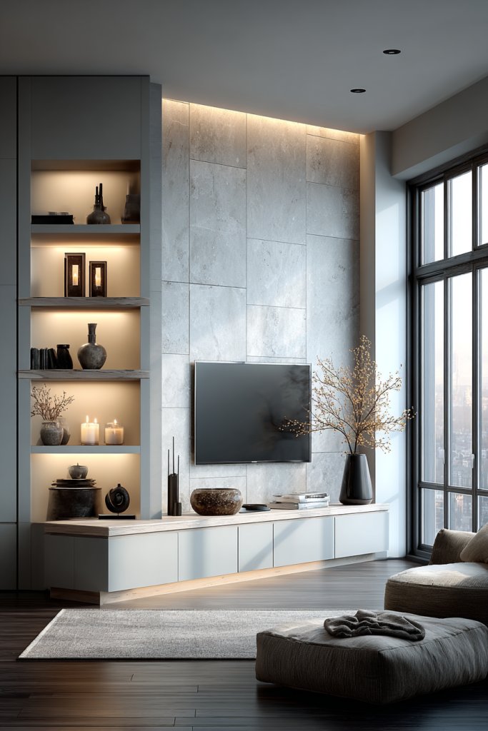 Visualize slim, wall-mounted cabinets with a matte or glossy finish, featuring open shelves or cubbies. Store media devices and accessories behind closed doors, leaving space to display a few select decor objects—textured ceramics, sculptural pieces, or personal mementos. The floating design adds a sense of spaciousness, while open sections break up the visual mass, creating a balanced, modern look. The overall effect is sophisticated and minimal.