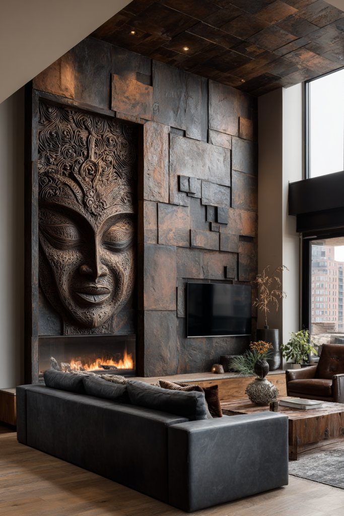 Imagine geometric metal wall panels or abstract metal sculptures mounted directly behind your TV. The metallic finish reflects light and adds a modern, industrial touch. These accents create a layered backdrop that adds depth and visual interest, especially when paired with textured wall paint or fabric panels. The interplay of light and shadow makes your TV wall a true statement piece.