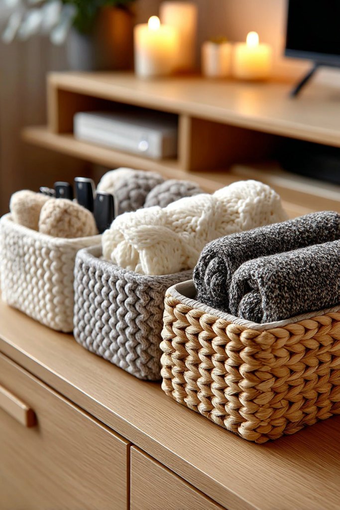Imagine woven or textured fabric baskets placed on open shelving or inside cabinets, holding remotes, chargers, or magazines. They come in various sizes and colors, blending seamlessly with your decor. The baskets add warmth and softness, contrasting with sleek surfaces or metal accents. When filled with neatly organized items, they create a calm, cohesive look that’s both functional and beautiful.