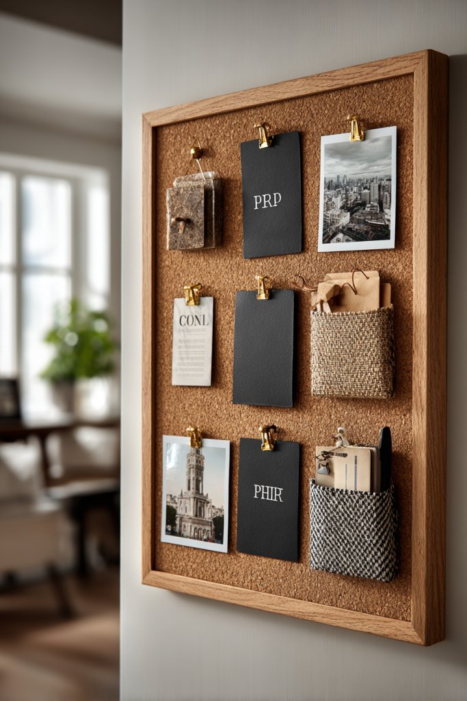 Choose materials like cork, magnetic panels, or pegboards based on your needs. Paint or frame the boards in colors that blend with your decor or make a bold statement. Use clips, clips with decorative elements, or magnets to hold your items. Incorporate small shelves or ledges for displaying mini sculptures or textured objects. The setup can be as minimal or as elaborate as you like.