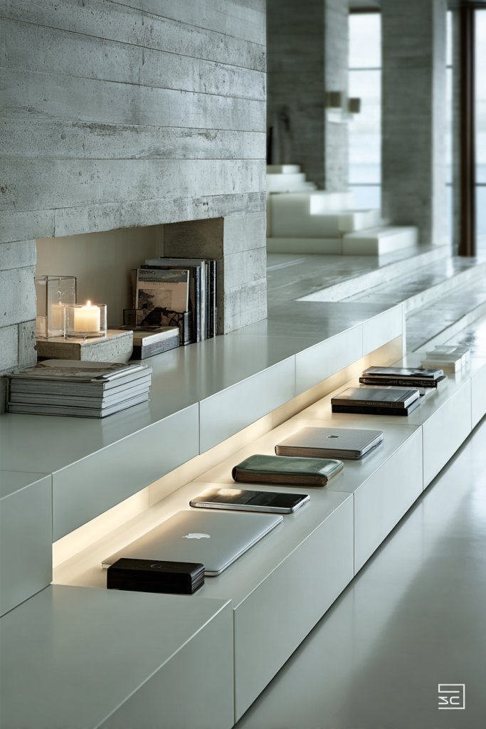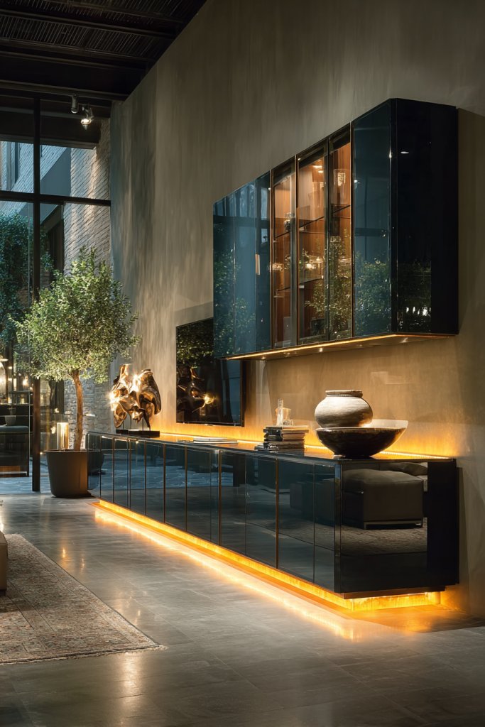 Visualize a sleek, low-profile console in a rich wood or lacquer finish, stretching across your wall. Underneath, hidden LED strips cast a gentle glow, highlighting the console’s shape and adding ambiance. Decorative objects like sculptural pieces or textured ceramics sit atop, contrasting with the sleek surface. The lighting creates a layered, luminous effect that transforms the space after dark.
