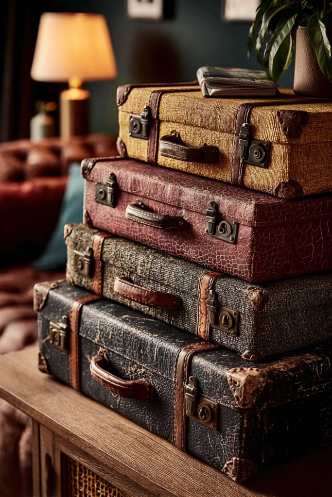 Add personal touches like monograms, painted details, or fabric liners inside the suitcases. Incorporate textured fabrics like faux fur or velvet on top for a cozy vibe. Use vintage luggage as a backdrop for other decor items, like framed photos or sculptural pieces. Mix in modern elements for contrast, such as sleek metallic accents or contemporary textiles. Let the suitcases tell your unique story.