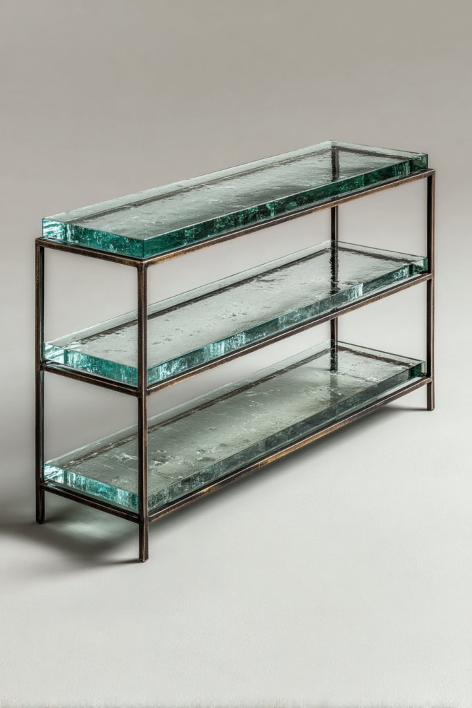 Envision slim, tiered metal stands with glass shelves, displaying a curated selection of decorative objects. The reflective glass adds depth, while the metal frames provide structural contrast. Place items like textured ceramics or sculptural pieces on each tier, creating a layered, balanced look. The open design allows light to flow freely, making the space feel larger and more open.