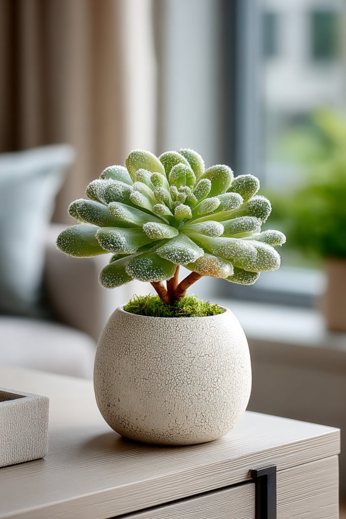 Imagine small faux succulents or leafy greenery in modern, minimalist pots placed on floating shelves or side tables. The textured leaves and vibrant colors mimic real plants, adding depth and softness to your decor. They sit effortlessly beside your TV, providing a visual break from hard surfaces and adding a pop of natural color. The realistic details make it hard to tell they aren’t real.