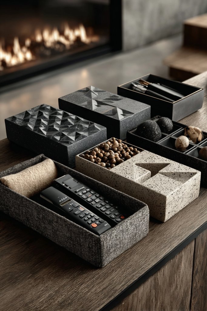 Picture a set of angular, textured baskets in matte or metallic finishes placed on open shelves or next to your TV. Their geometric shapes contrast beautifully with soft textiles or smooth surfaces nearby. Inside, remotes, cables, and small gadgets stay neatly contained. The textured surfaces and sharp lines create a contemporary, sophisticated aesthetic. The visual contrast makes your setup more dynamic.