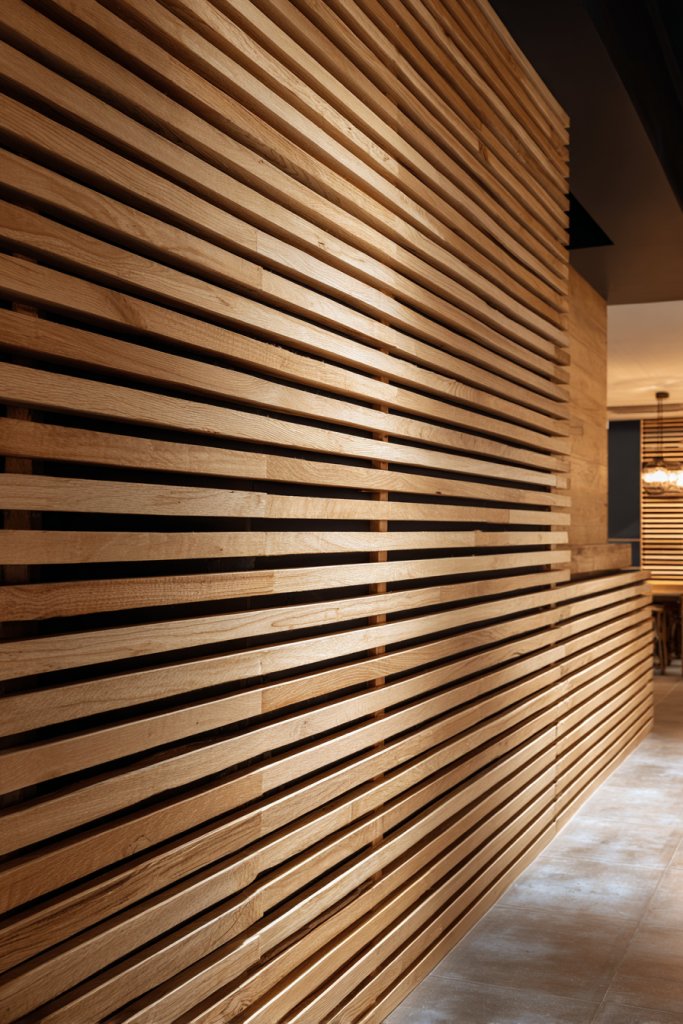Opt for light woods like pine or birch for a fresh, airy look, or darker woods like walnut for richness. Horizontal slats tend to make a space appear wider, while vertical slats add height. You can leave the wood natural or paint/stain for different effects. Use in living rooms, bedrooms, or even behind a home office desk for a calming background.