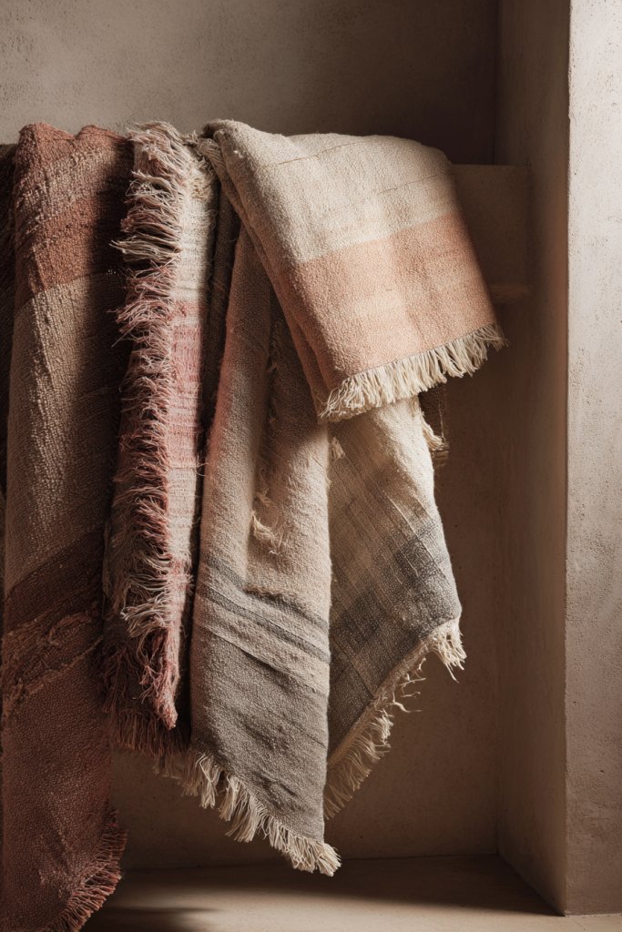 Visualize multiple textured textiles hanging in overlapping layers—think woven, embroidered, or fringed fabrics. The layers add dimension, making the wall appear more dynamic and tactile. Natural fibers like jute or cotton in earthy tones evoke tranquility, while bold prints add energy. The combination creates a bohemian or eclectic vibe that feels both relaxed and curated.
