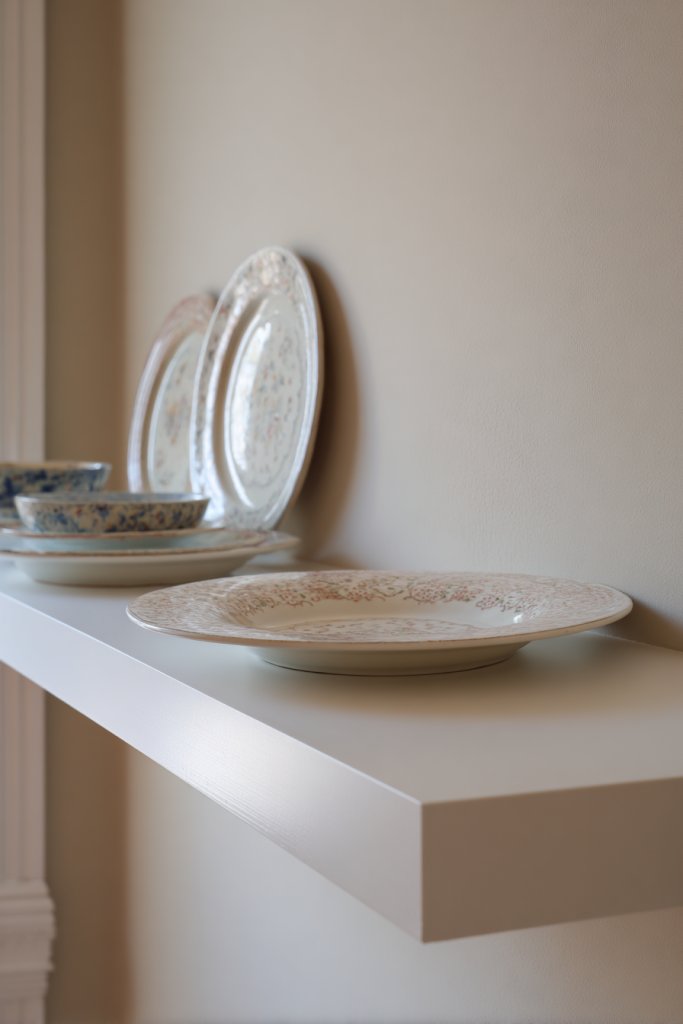 Picture a series of floating shelves arranged at varying heights, each holding beautifully crafted plates or ceramics in vibrant glazes or intricate patterns. The artful placement creates a visual rhythm, drawing the eye along the wall. The glossy finishes and unique shapes add a playful, sophisticated touch to your space. It’s like having a mini gallery right in your home.