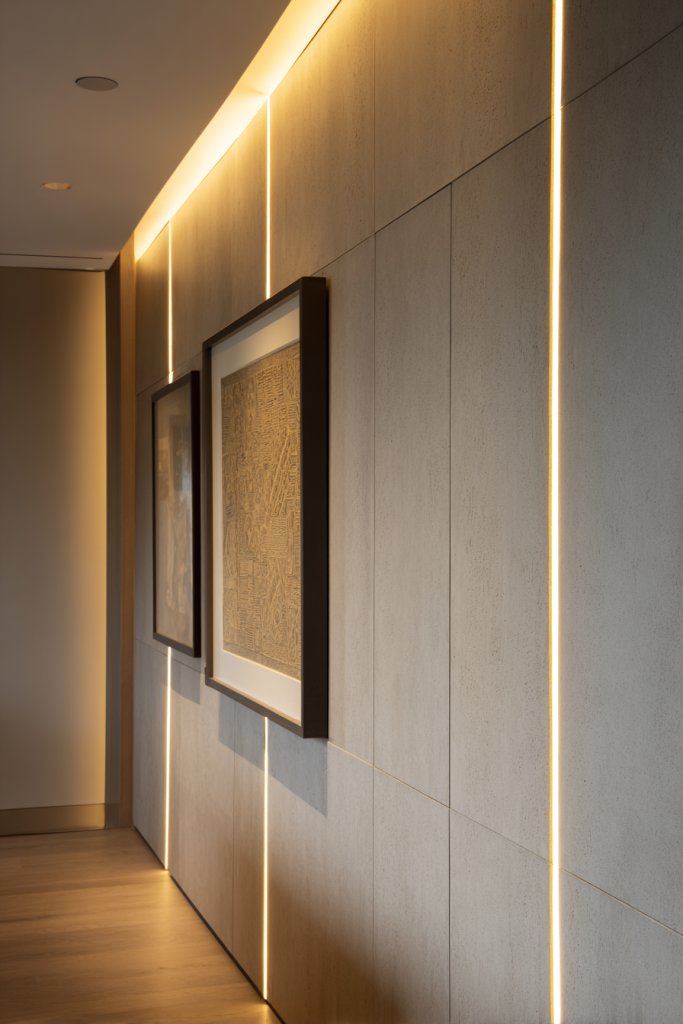 Imagine a sleek panel or artwork with hidden LED strips behind it, casting a gentle halo of light. The glow highlights textures and shapes, creating a layered, almost three-dimensional effect. When dimmed at night, the lighting offers a cozy ambiance. During the day, the art remains a beautiful focal point, elevated by the backlighting.