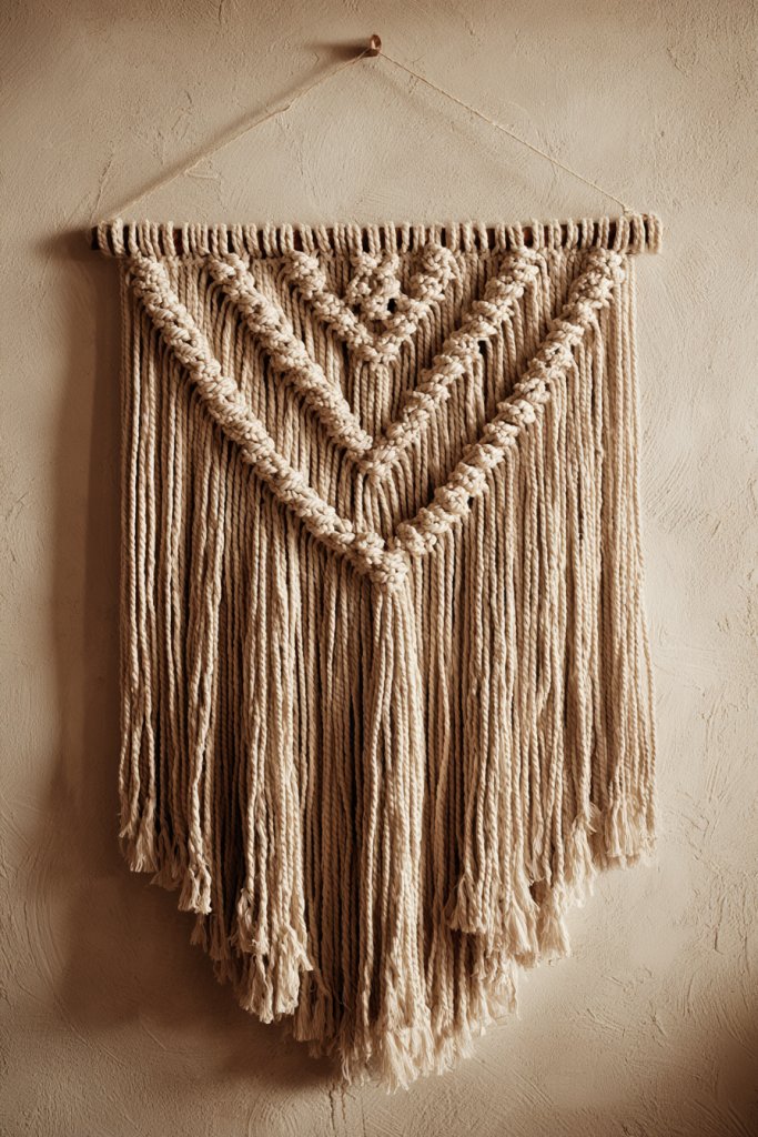 Picture a large, intricately knotted macramé piece with fringe details hanging above a sofa or bed. The textured knots and patterns create visual depth, while the soft fibers add a tactile element. The neutral tones or vibrant colors set a relaxed, artistic tone in the room. When paired with other textiles, it amplifies the layered, cozy aesthetic.
