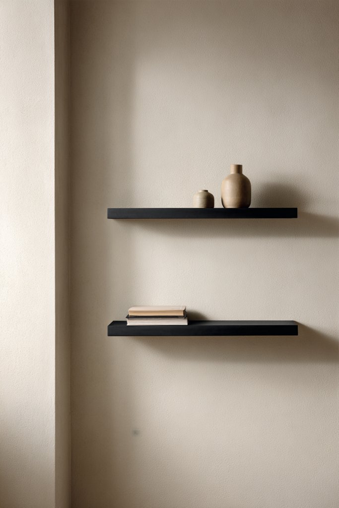 Picture narrow, wall-mounted shelves in matte black or warm wood tones, floating seamlessly against a wall. They hold a curated collection of colorful books, textured ceramics, or woven baskets. The open design creates a layered, uncluttered look that invites the eye to explore. The minimal hardware makes the shelves appear to hover, adding a futuristic touch to your decor.