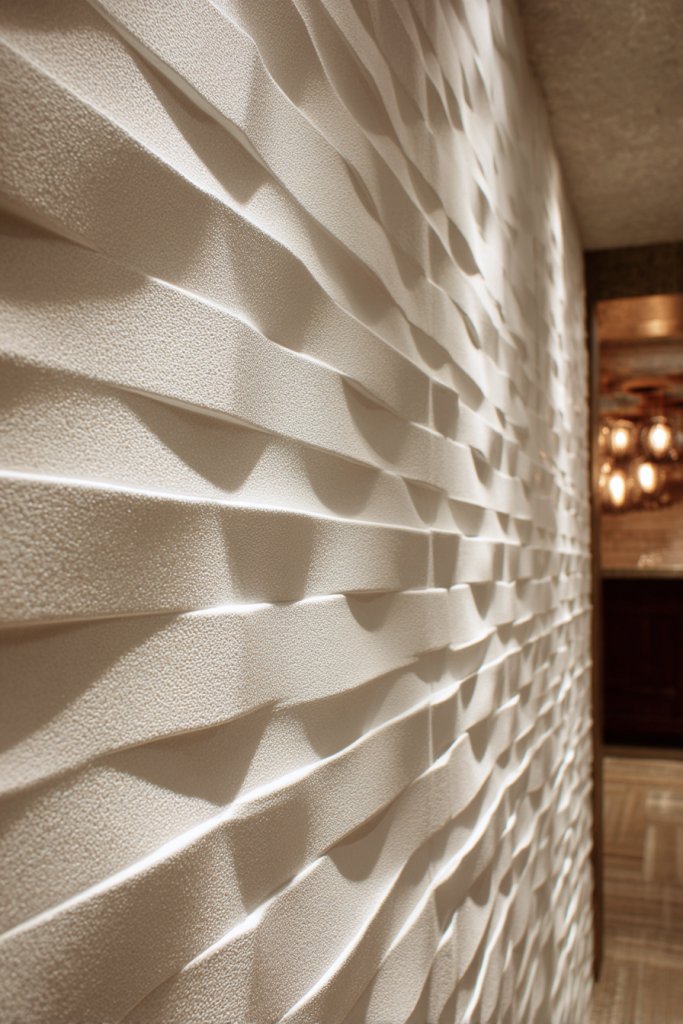 Imagine a wall covered in panels with geometric or organic patterns, protruding at different depths. The textured surfaces catch light and cast shadows, creating a dynamic visual effect. Materials like wood, PVC, or foam make the panels lightweight yet durable. The interplay of shadow and highlight adds a sculptural dimension that makes the space feel more alive.