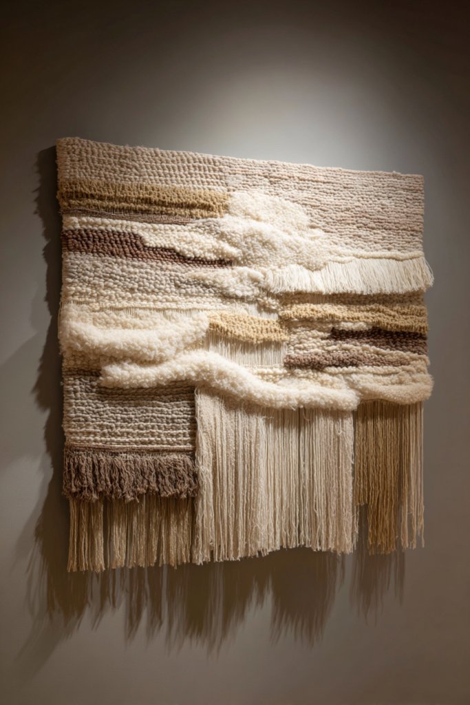 Imagine a large, woven textile with fringed edges hanging gracefully on your wall. The soft fibers and varied textures create an inviting focal point that softens the room’s vibe. Natural materials like jute, cotton, or wool add an organic touch, while tassels and embroidery provide detail. The fabric’s thickness and pattern influence the room’s warmth and personality.