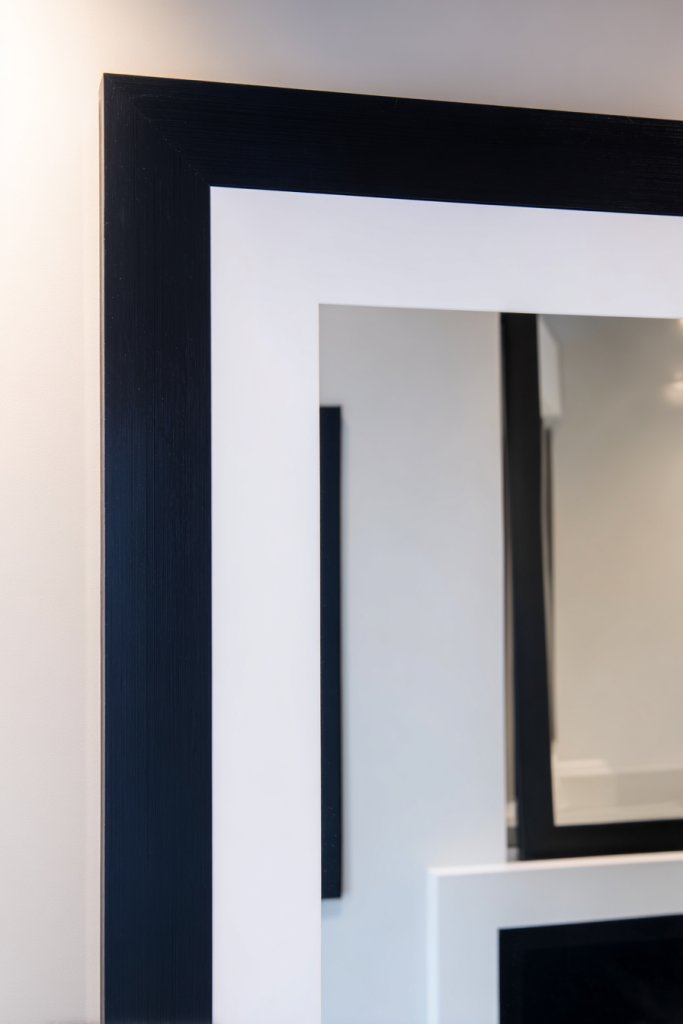 Visualize a large, rectangular mirror with a thick matte black frame hanging above a sofa or console. The dark border creates a striking contrast against lighter walls, making the mirror pop. The reflective surface brightens the room, while the bold frame anchors the space with a modern edge. It’s both functional and fashionable.