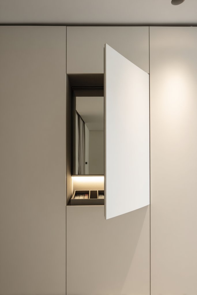 Imagine a flush-mounted mirror set into the wall with a discreet handle or latch. Behind it lies a hidden compartment for storing accessories, keys, or even small electronics. The reflective surface brightens the room and adds depth, while the secret storage keeps clutter out of sight. It’s like a magic trick in your wall.