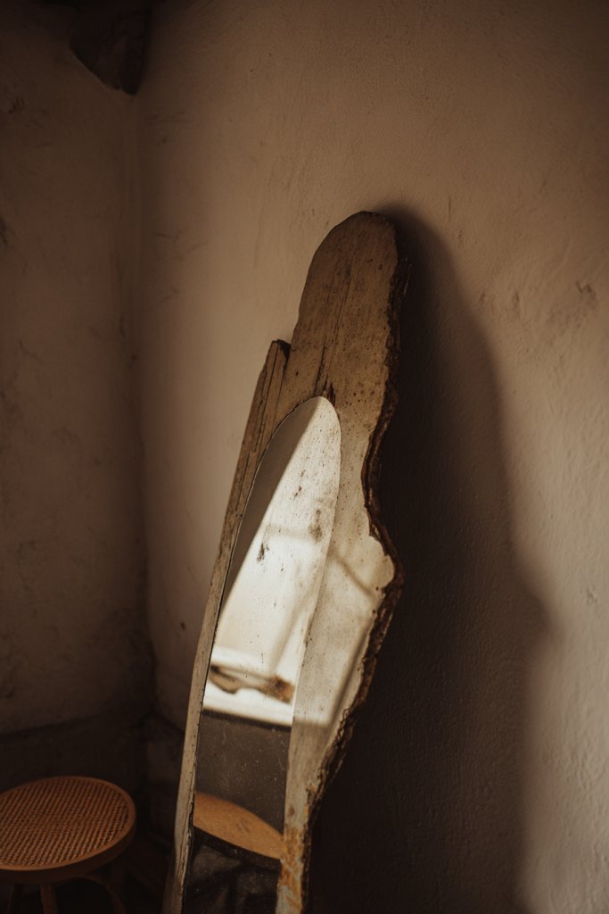 Visualize an irregular-shaped vintage mirror with ornate detailing, maybe a distressed finish or an asymmetrical frame. Its unusual silhouette catches the eye immediately and becomes a conversation starter. The mirror’s surface reflects light and the room’s personality, enhancing the overall vibe. It’s a piece of functional art.