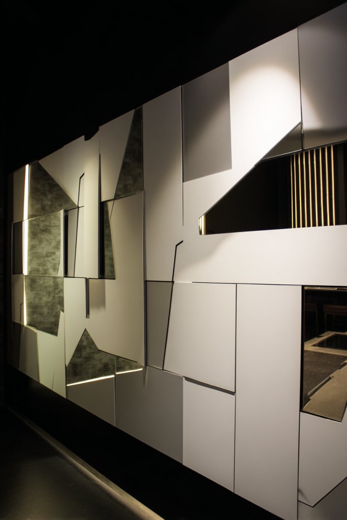 Picture a wall adorned with interconnected mirror panels arranged in angular, geometric patterns. The reflective surfaces bounce light in different directions, creating a dynamic, textured effect. The sharp lines and varied shapes add a sense of movement and sophistication. It’s like a piece of modern art that also enhances space.