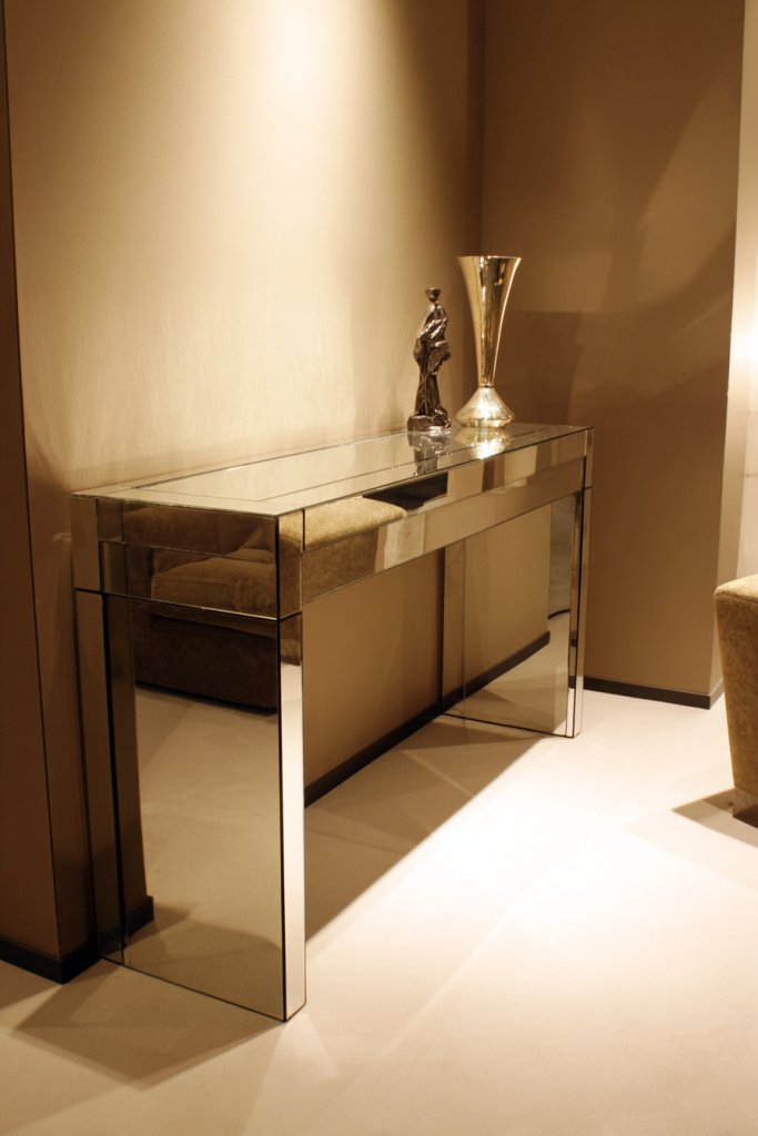 Visualize a slim, elegant console table with a shimmering mirrored surface, topped with a few decorative items like sculptural pieces or textured trays. The reflective top amplifies light, making the area feel brighter and more spacious. Its sleek silhouette adds sophistication without overcrowding the room. The mirror’s subtle shine complements modern decor perfectly.