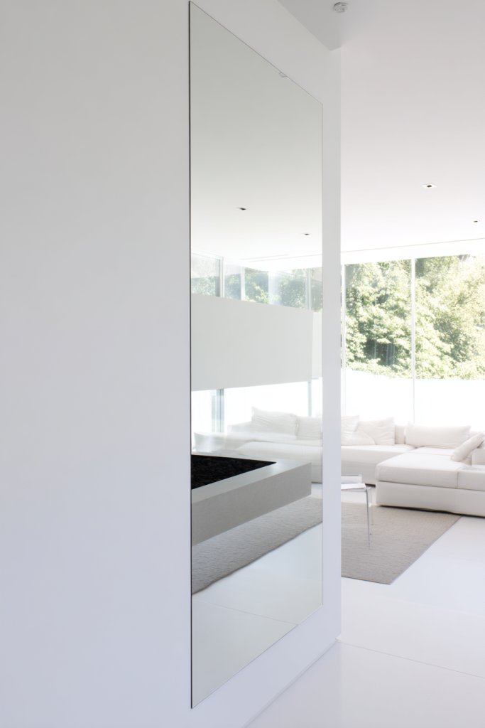 Imagine a large, edge-to-edge mirror mounted flush against a wall, reflecting the entire room. The absence of a frame makes it appear almost like a window, amplifying light and space. The mirror’s surface captures the subtle textures of your decor, adding a sense of depth and clarity. Its sleek silhouette elevates any room instantly.